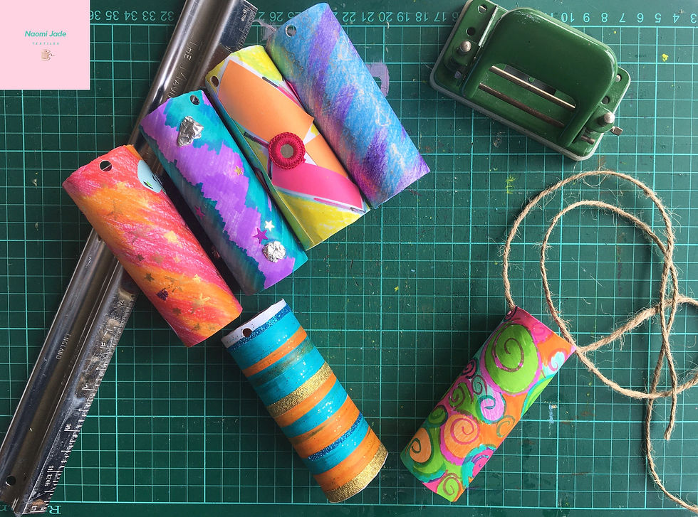 When you have all your tubes finished, use a pencil to mark out were you need to use a hole punch ready for hanging. You'll need one on each side, thread your yarn through the two points and up. Knot well to ensure no damages, here you can play with different lengths on each tube, mix it up do as you fancy.